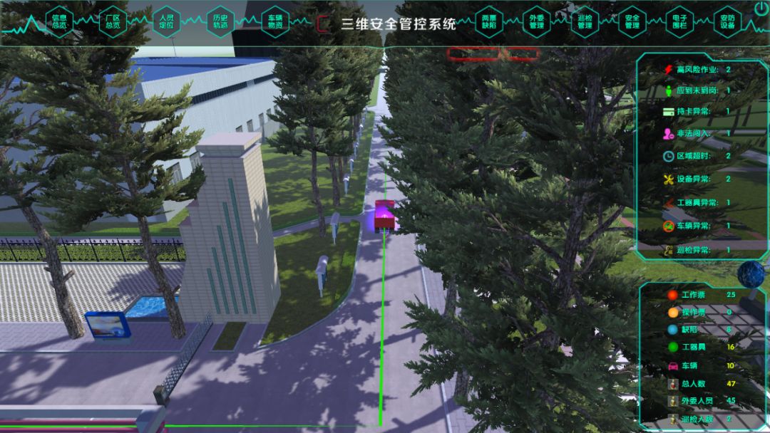 進出廠區(qū)的運送固廢車輛,危化品車輛、外來車輛、重型機械等安裝GPS定位。在系統(tǒng)中為車輛預設固定路線,并通過GPS進行追蹤,實現(xiàn)各類車輛的實時位置監(jiān)督、跟蹤其行駛軌跡,一旦發(fā)現(xiàn)偏離預設路線立即報警并推送相關管理人員。